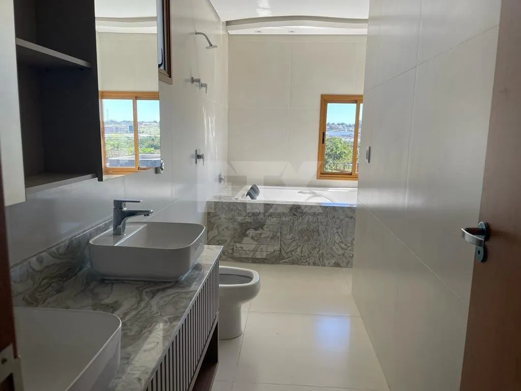 Lindo sobrado no Alphaville 3. No piso térreo: sala de estar com pé-direito duplo, sala de jantar integrada, sala de TV/home office, 01 suíte, lavabo, cozinha, lavanderia, área gourmet, piscina e banheiro externo. No piso superior: 03 suítes, 01 sala de cinema. Diferenciais: Suíte Master com portas de vidro reflecta bronze, painéis em MDF, rack e cabeceira estofada. Móveis planejados na cozinha, área gourmet, lavanderia e todos os banheiros das suítes. Banheiro da suíte Master com banheira de hidromassagem aquecida e bela vista! Piscina com hidro, cascata, iluminação em LED e controle remoto, aquecedor solar. Telhado shingle, proporcionando beleza, qualidade e durabilidade excepcionais. Venha conferir!