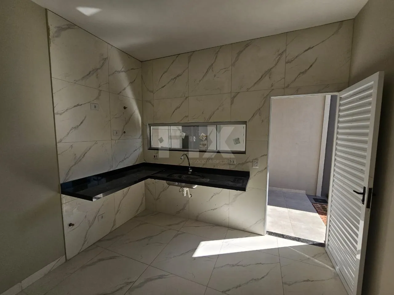 – Mármores preto são Gabriel e travertino.