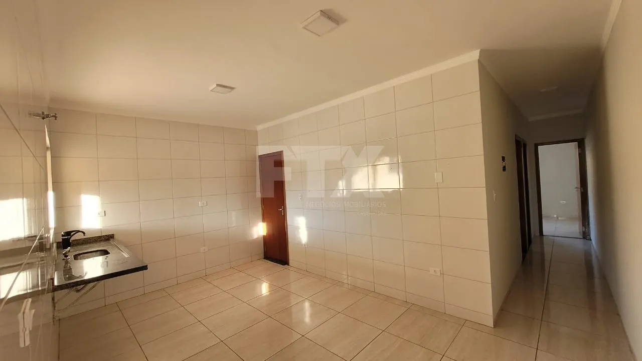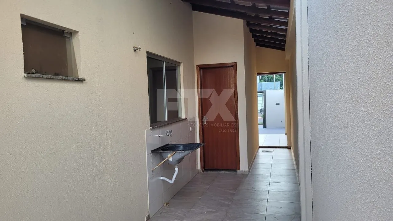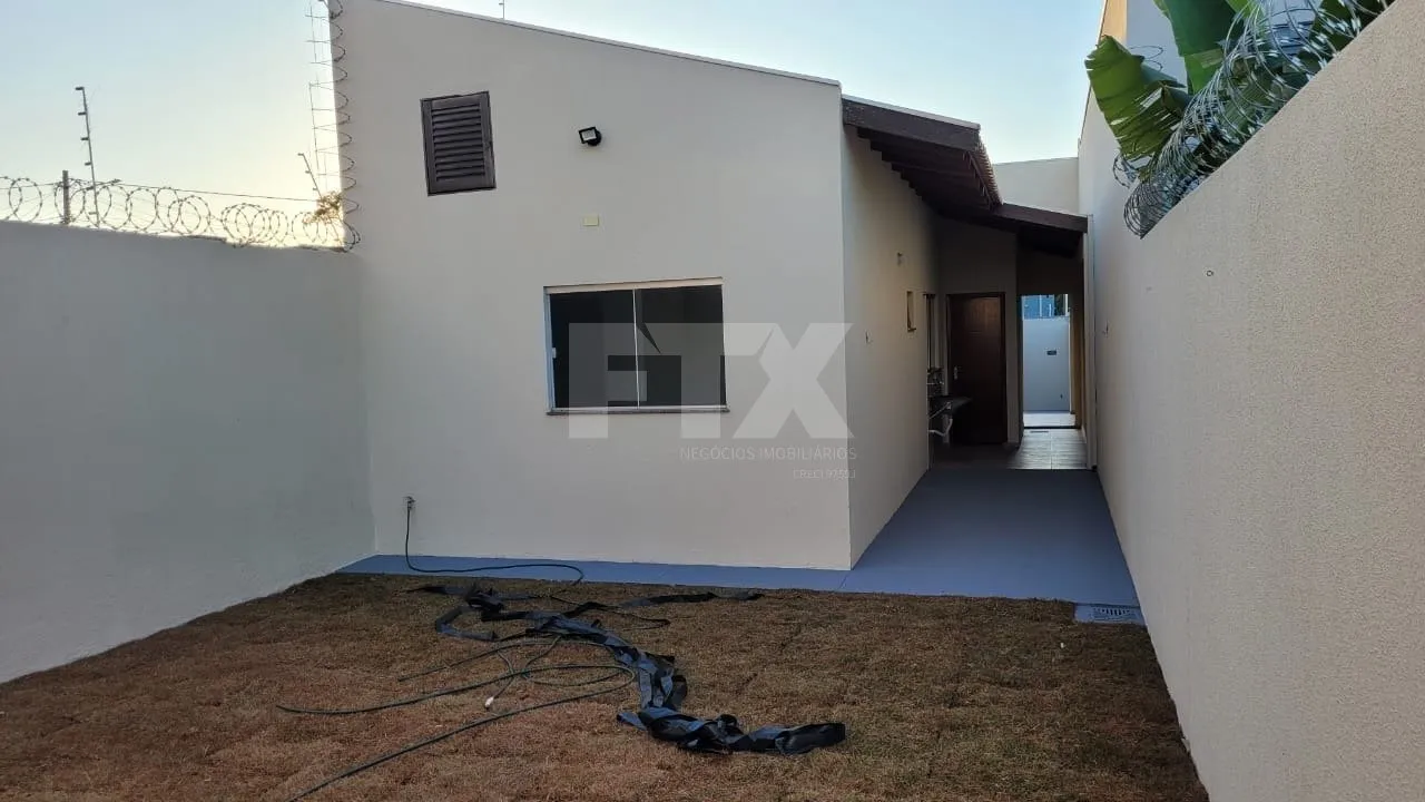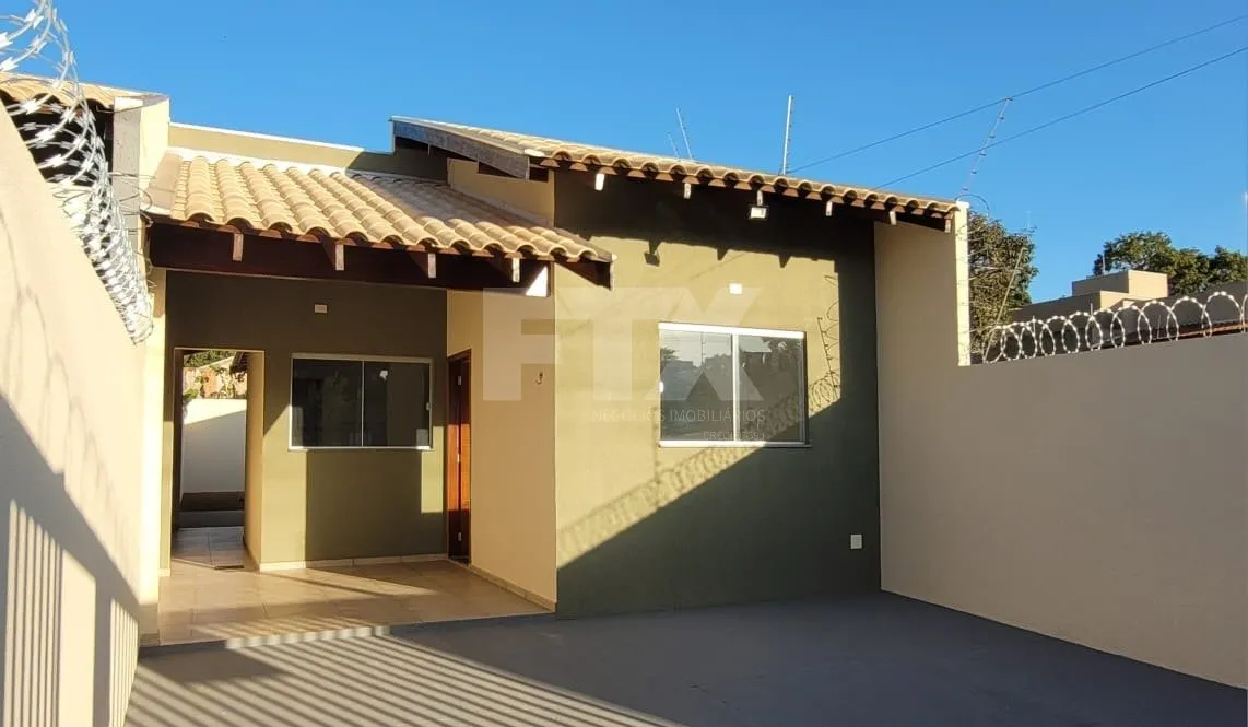 Casa com 2 quartos; sala; cozinha; banheiro; lavanderia coberta; garagem coberta para um carro e descoberta para dois e quintal nos fundos com gramado.
