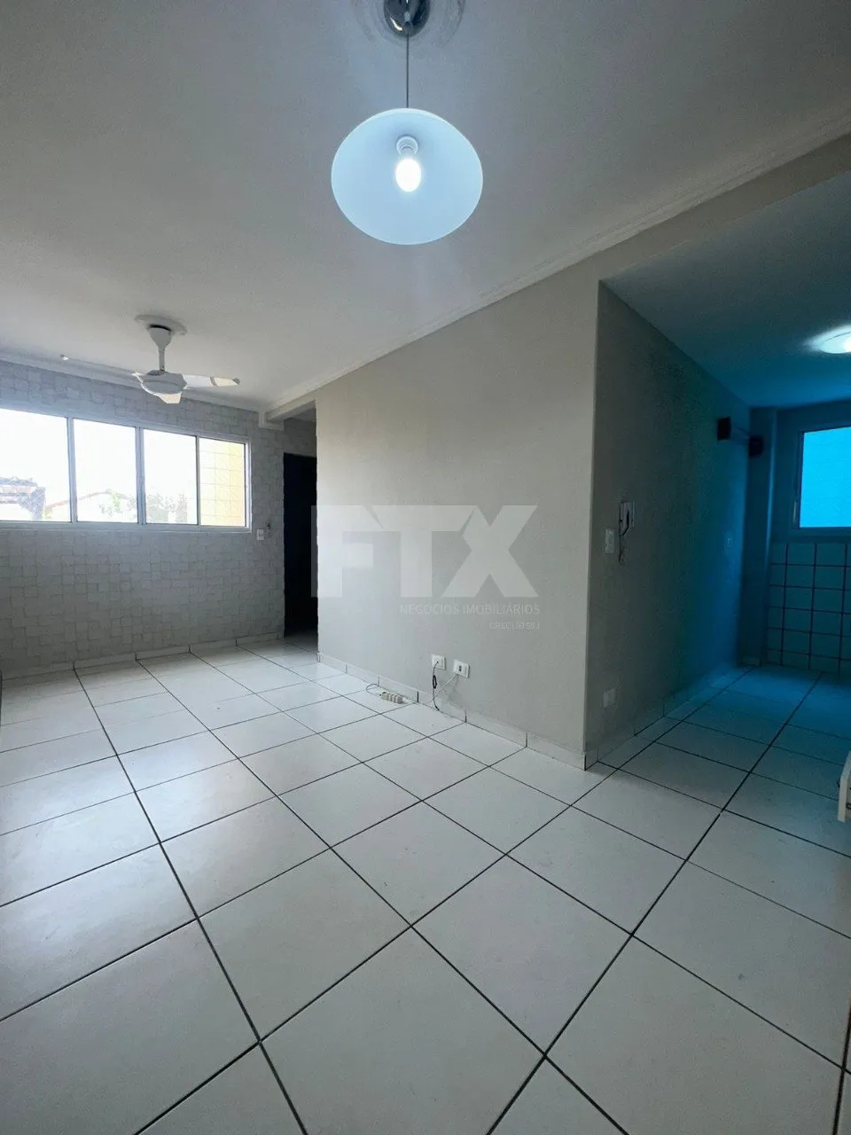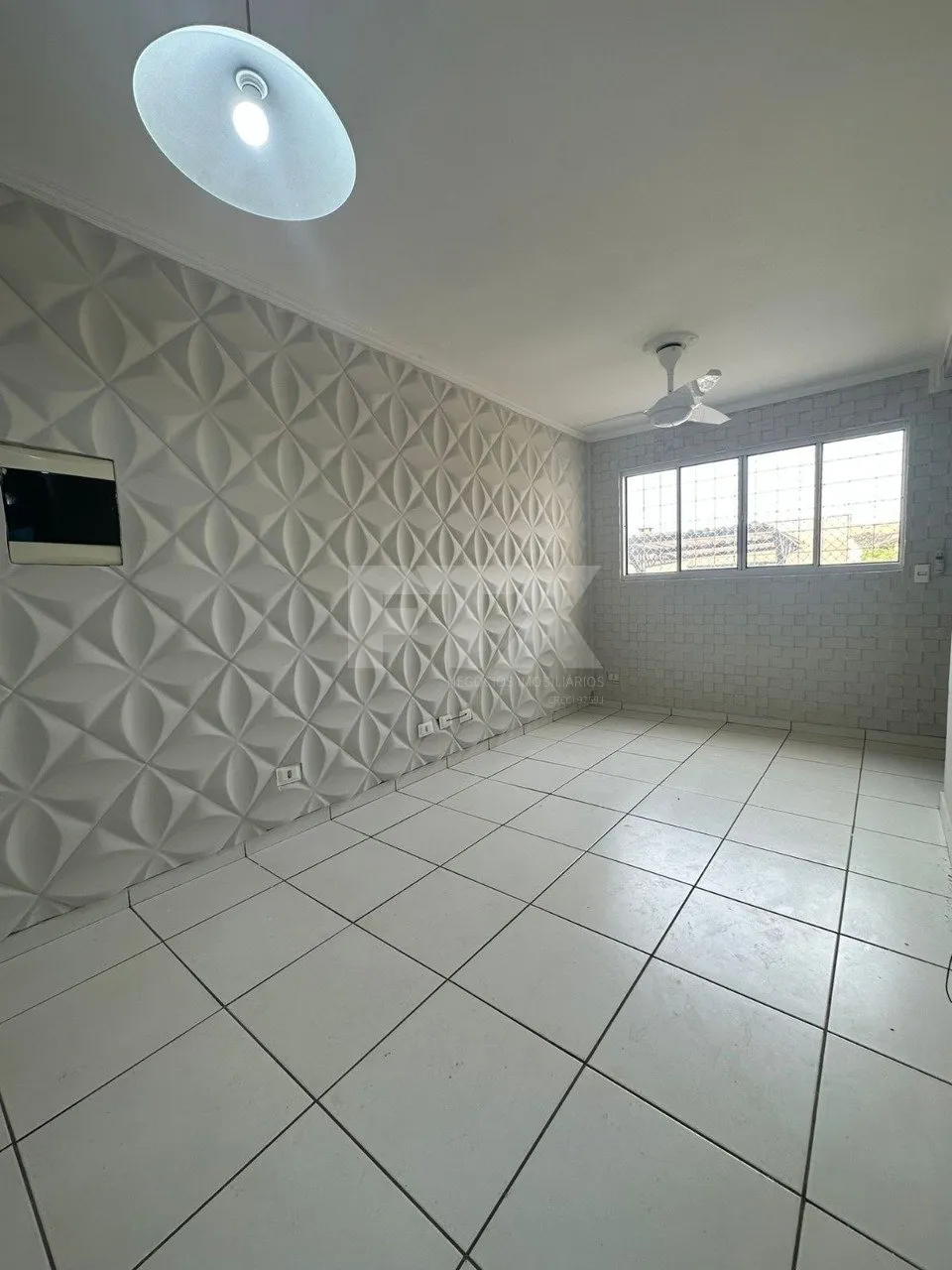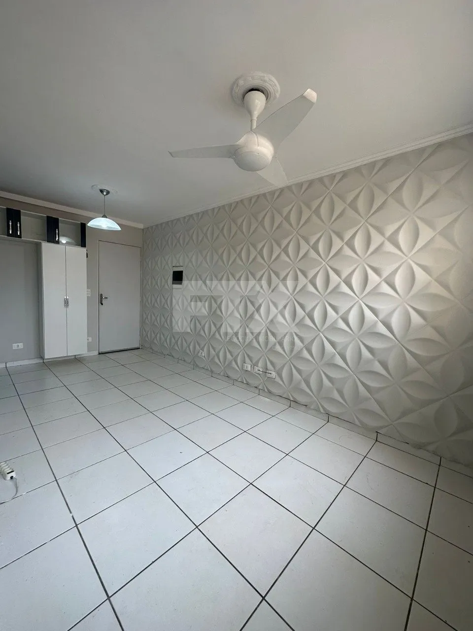 Sala com parede decorada, proporcionando um charme extra ao ambiente, e ventilador de teto