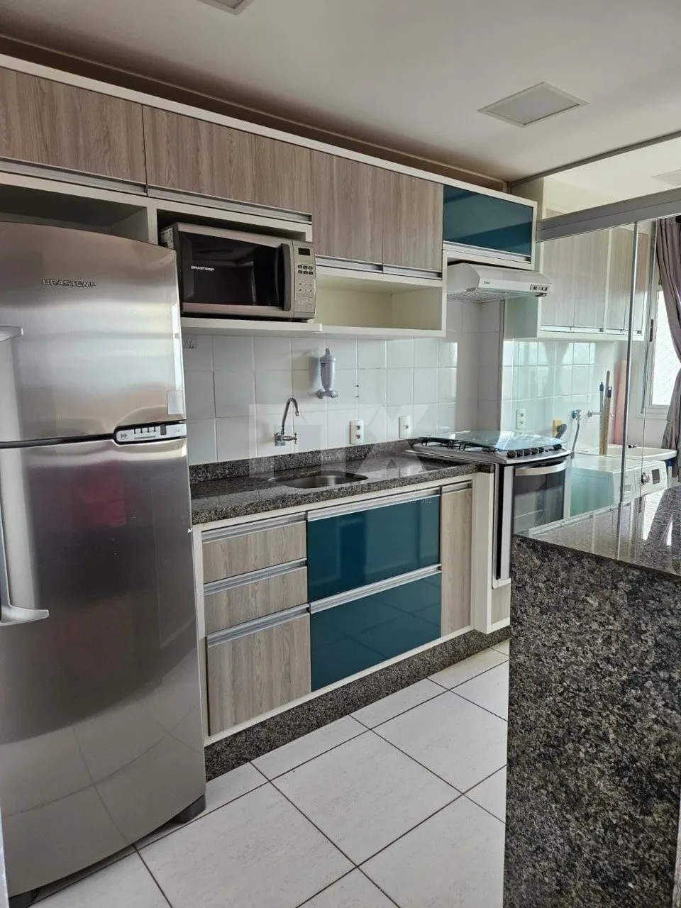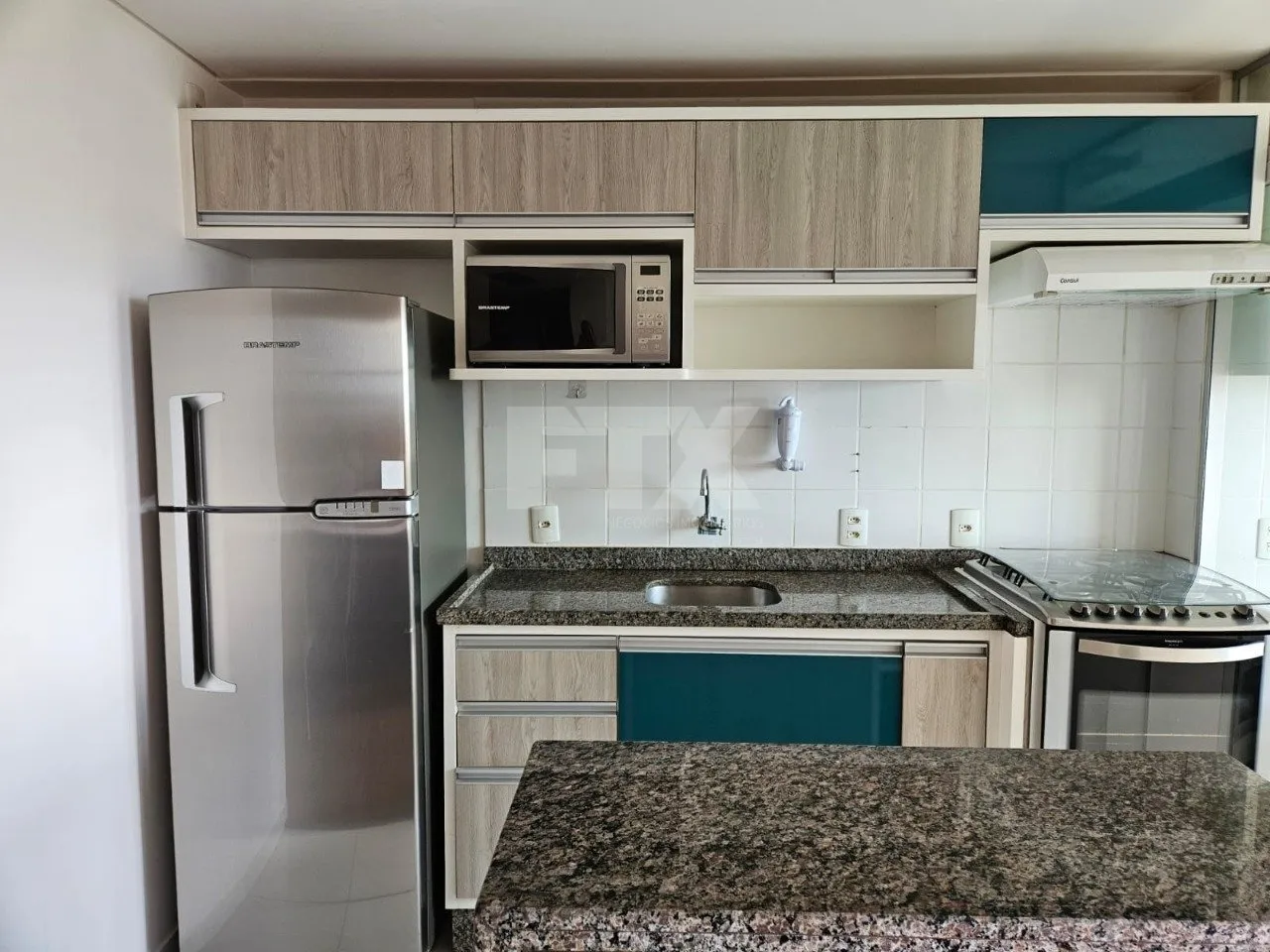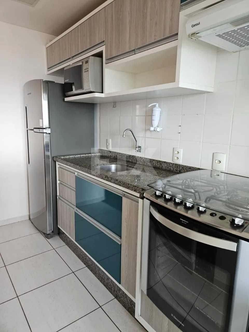 Cozinha equipada com geladeira, fogão, micro-ondas e coifa.