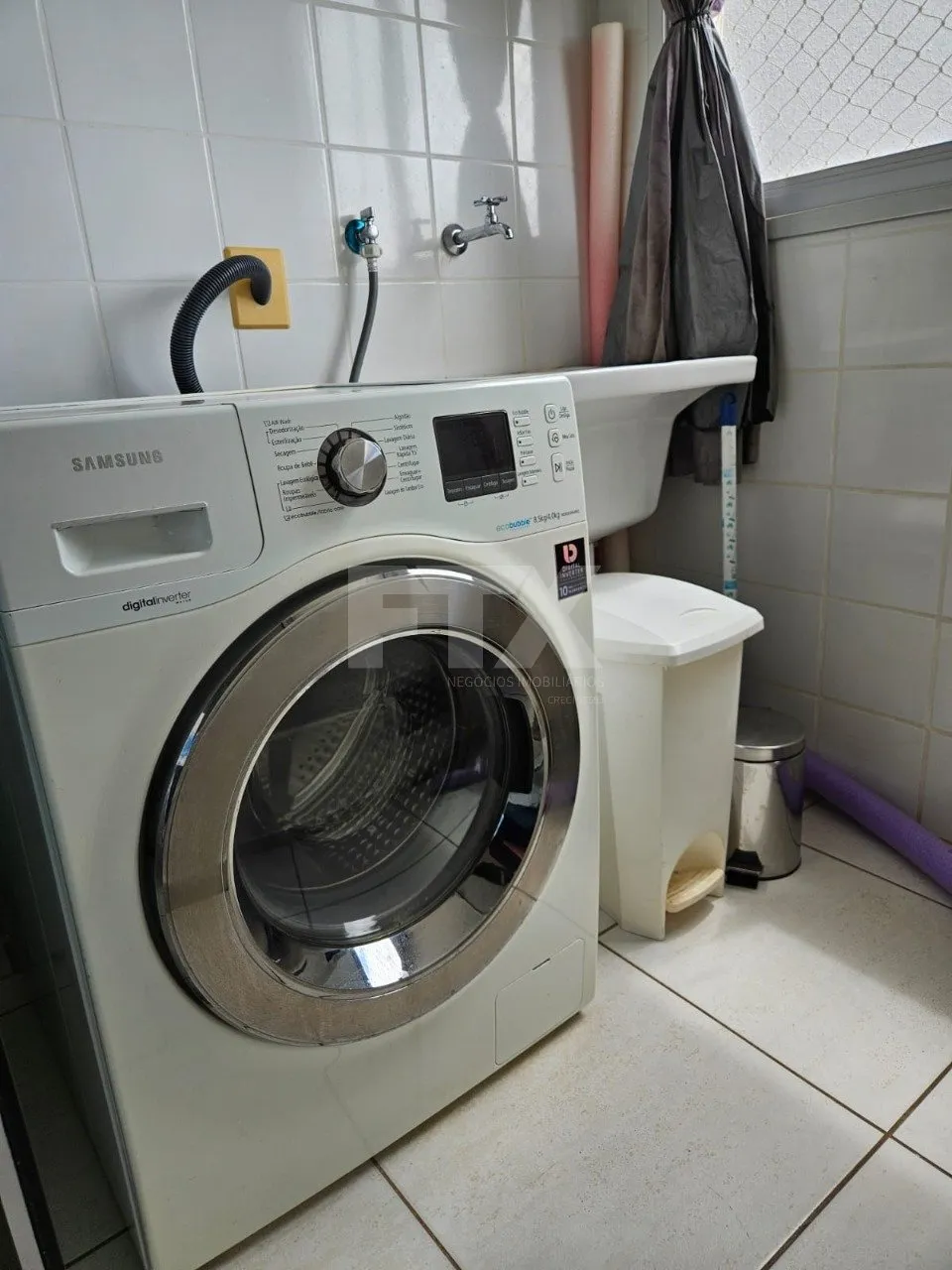 Lavanderia com máquina lava e seca.