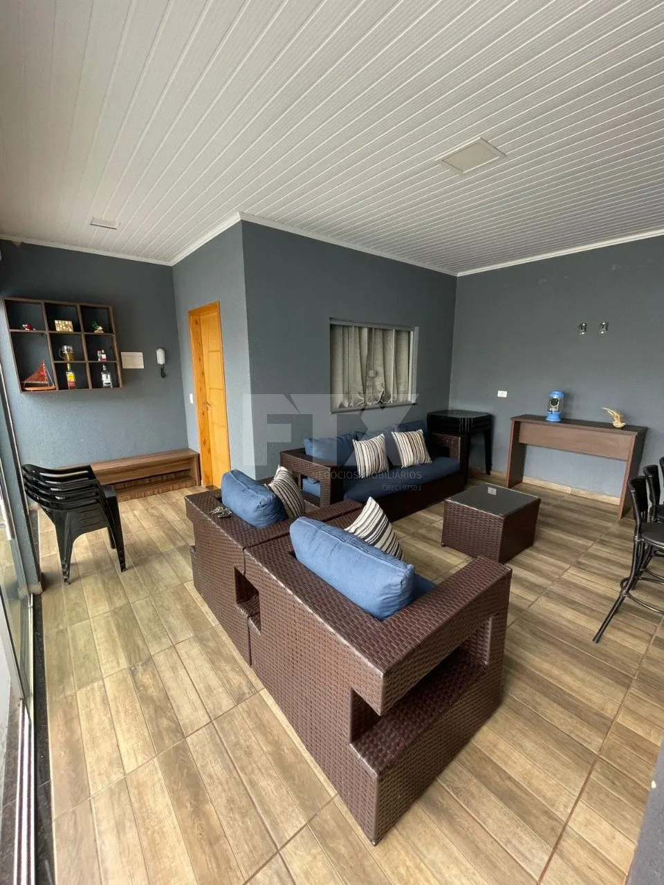 – Varanda mobiliada com sofá, poltronas, aparador e nichos decorativos