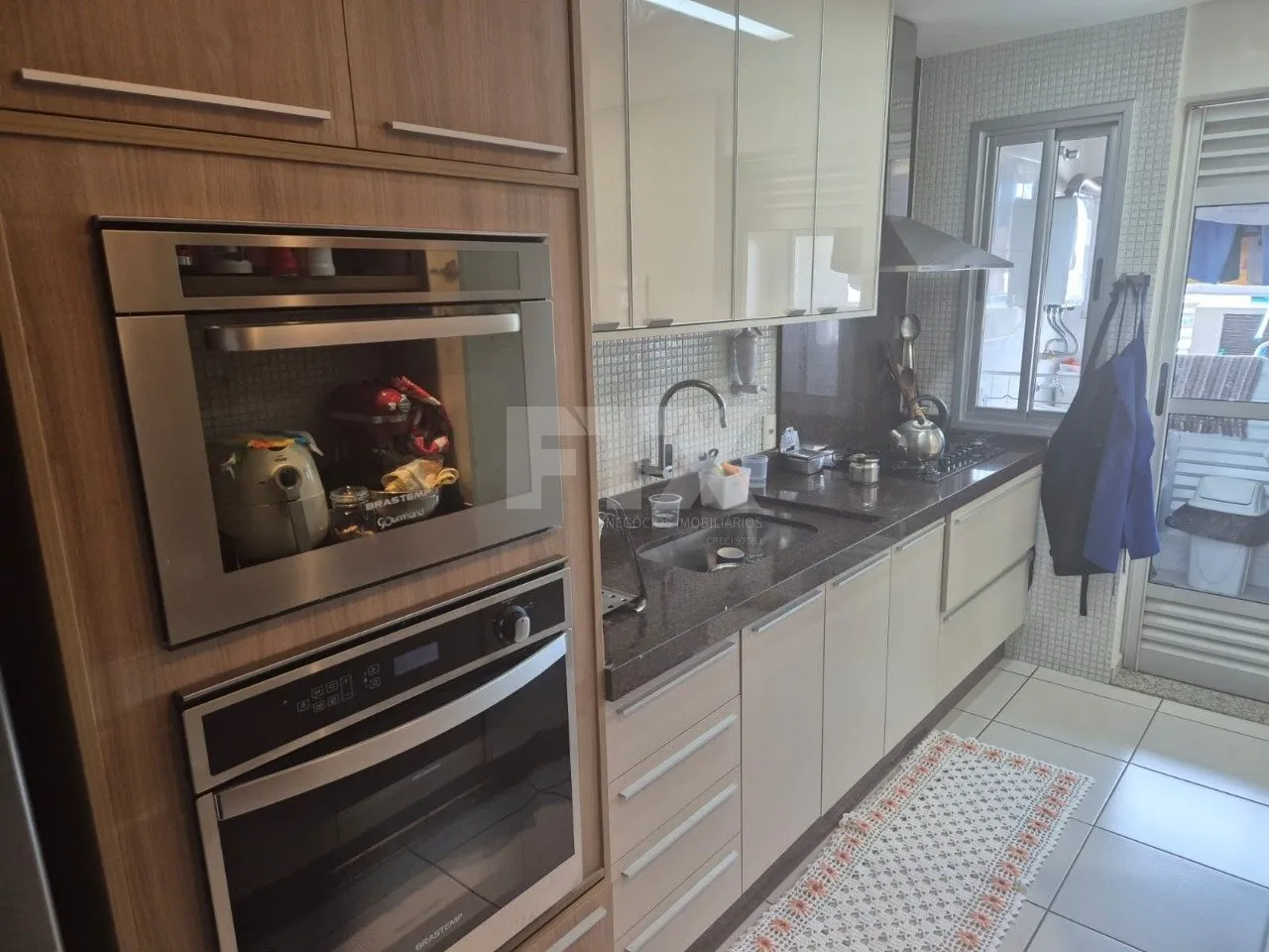 – Cozinha planejada com torre quente, cooktop e coifa