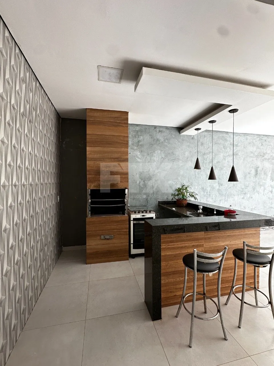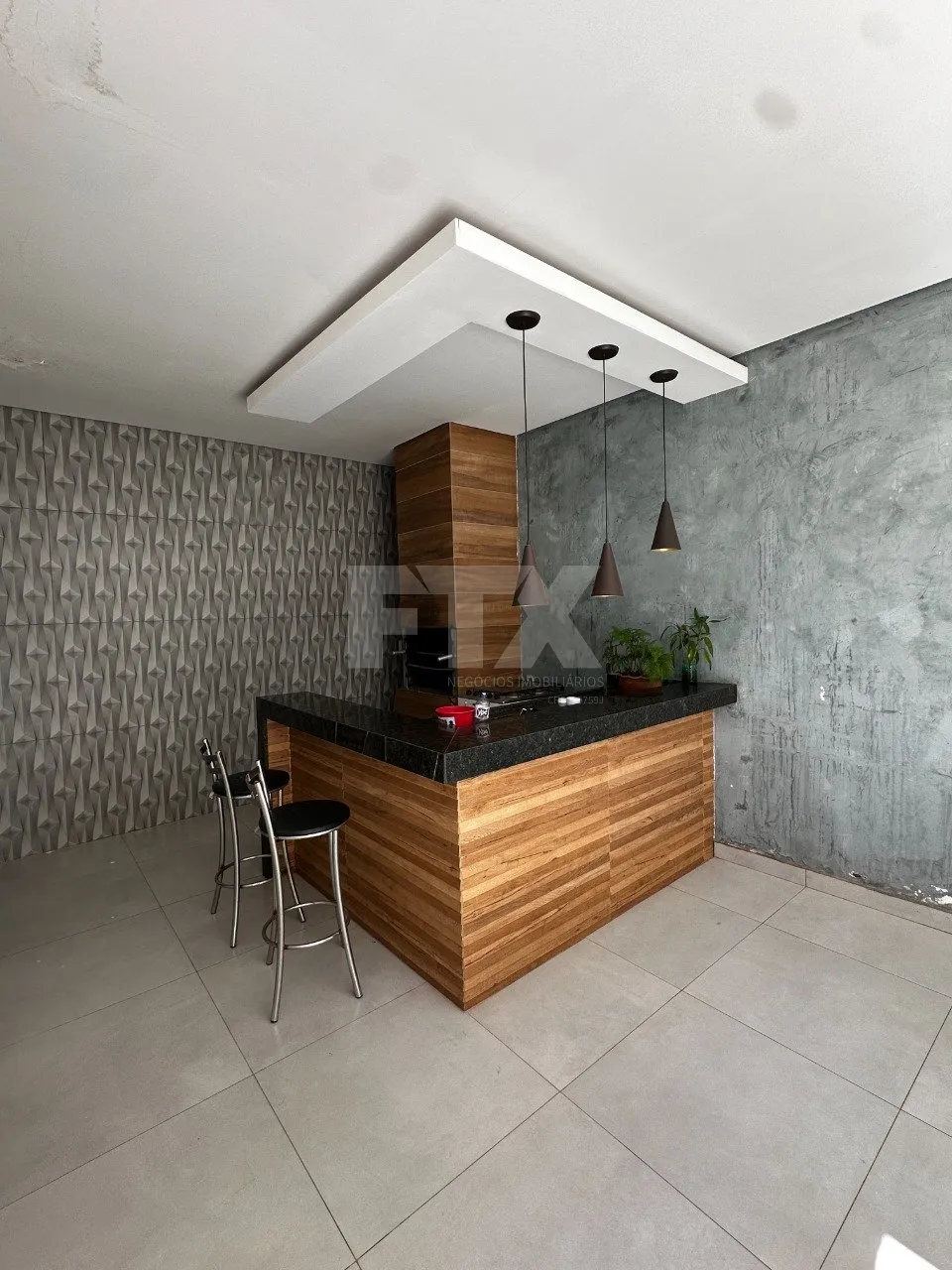 Área externa: lavanderia fechada, 1 quarto, banheiro e área gourmet: espaço amplo com churrasqueira e balcão, ideal para o lazer.