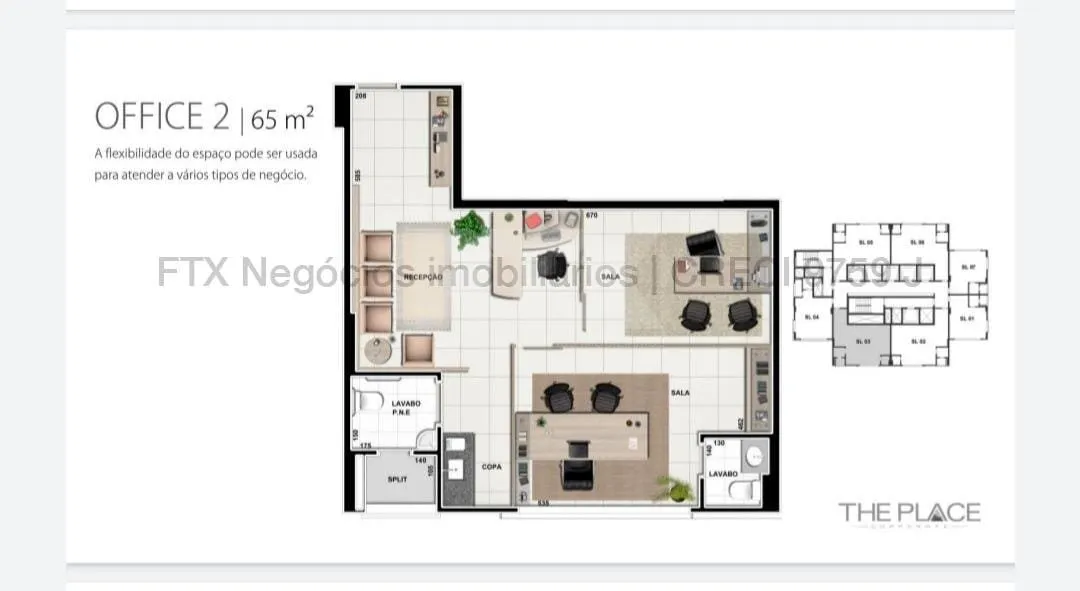 Sala ideal para escritórios e consultórios. Possui 65m², 02 lavabos, copa, móveis planejados e 02 aparelhos de ar-condicionado. Sala ampla que pode ser dividida conforme sua necessidade.